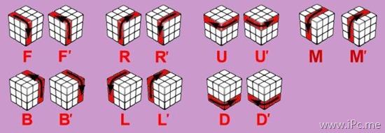 最后要说明的是:每面的名称是相对的,例如F是前面,就是手拿魔方时面向自己的一面,若把模仿旋转到另一面,那么就有新的一面成为前面。