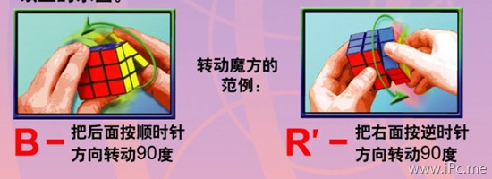 然后破解魔方功略里会用字母来说明要转动的1层或1面,以及方向:例如:R(代表右面顺时针转90度),R`(代表右面逆时针转90度),R2(代表右面顺时针转2次90度)